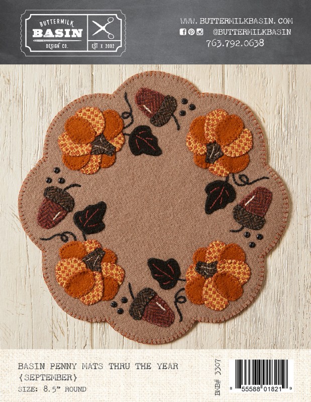 Pattern includes instructions by Buttermillk Basin to make an 8 1/2 inch round wool applique mat.