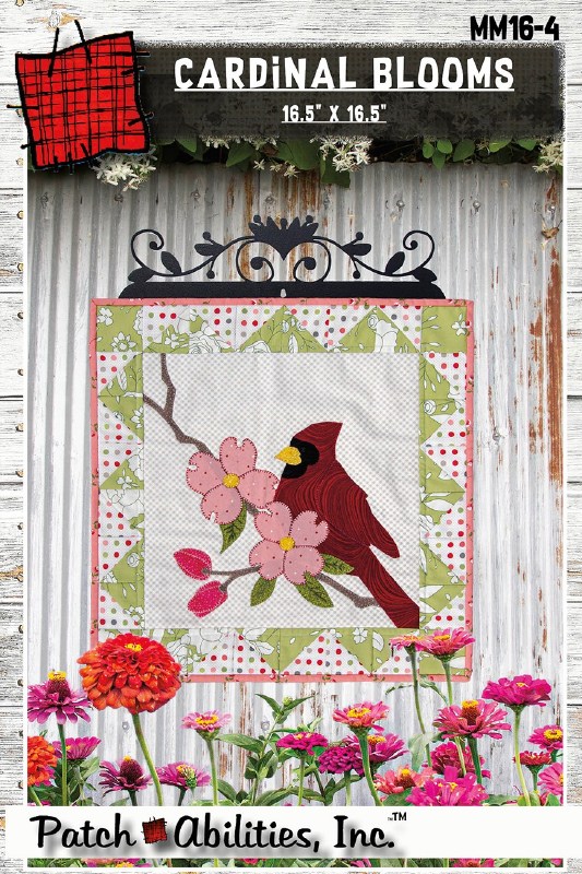 April in Monthly Minis series 16, this block of the month pattern series offers a beginner friendly combination of applique and piecing. A cheerful cardinal sits on a spring blooming branch of apple blossoms is made easy using traditional raw edge applique with fusible web. This pattern offers a block of the month stand alone wall hanging quilt measuring 16.5" square. Hangs easily with a 12 inch hanger shown.