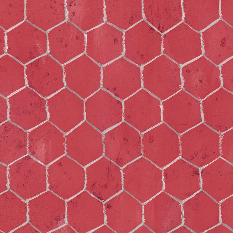 This fabric features a charming hexagonal pattern reminiscent of chicken wire, set against a soft, creamy background with subtle watercolor-like splashes of color.