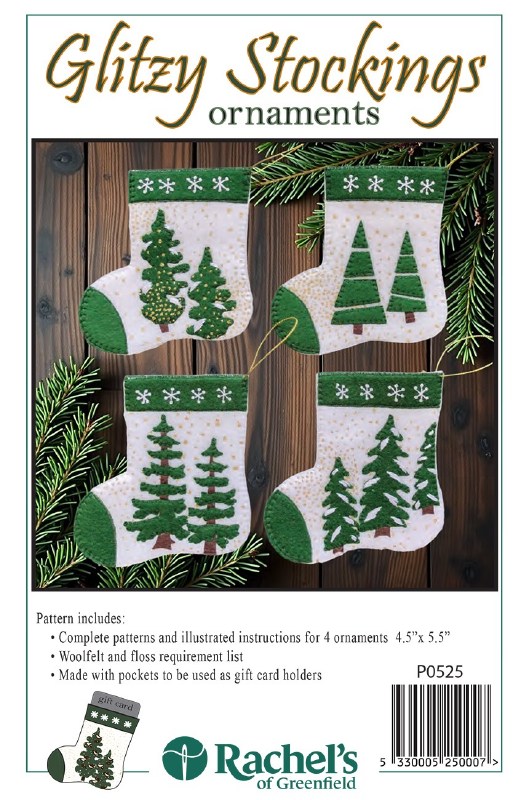 Pattern includes instructions by Rachel's of Greenfield to make 4 assorted stocking ornaments approximately 4 inch x 4 1/2 inch.