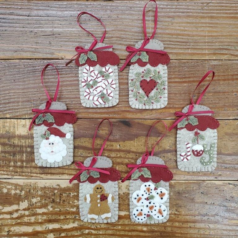 These are just the sweetest little wool applique canning jars to decorate your home with this holiday season! Hang them on your Christmas tree, connect for a fun garland or display individually on a knob or hook! They make great little gifts too! Each one measures approximately 2 1/4" X 3 1/4" .