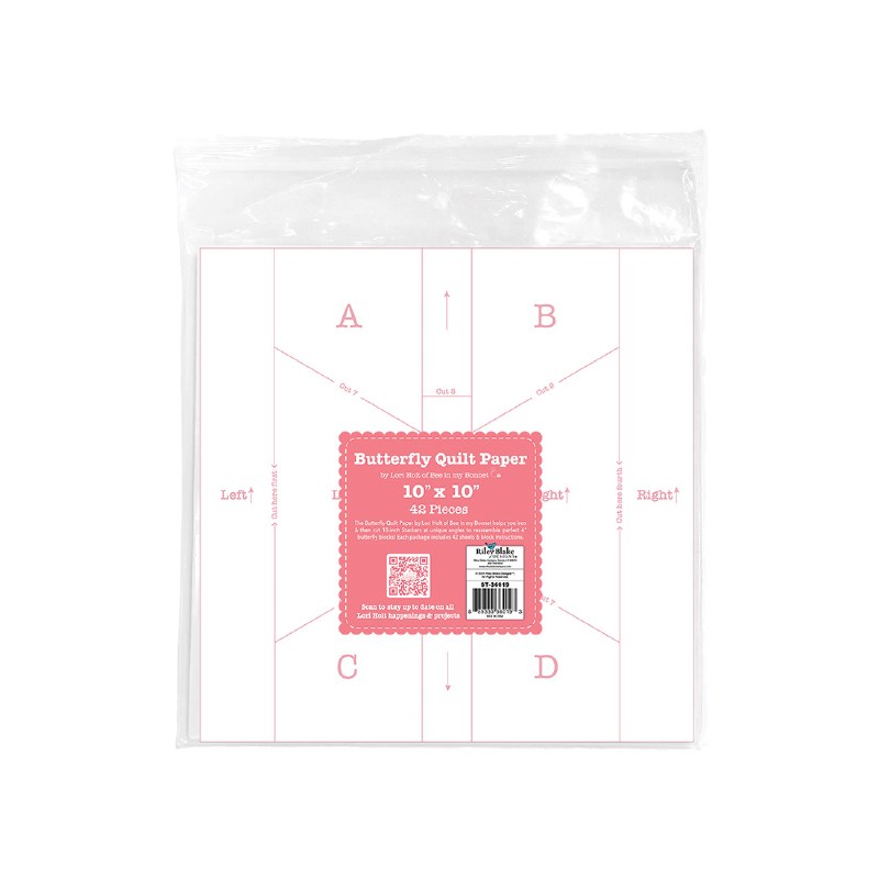 The 10in Butterfly Quilt Paper by Lori Holt of Bee in my Bonnet is iron-on paper that helps you cut out butterflies from 10-inch stackers at unique angles to reassemble as a fun 6" finished Pumpkin Quilt Block. Each package includes 42 sheets. These papers are needed to make Lori's Butterfly Paper Quilts featured on the Piece & Plenty storyboard. Instructions for the block and quilt setting will be included with the papers. Lori's 6 1/2" Trim-it ruler is recommended (STTI-5528).