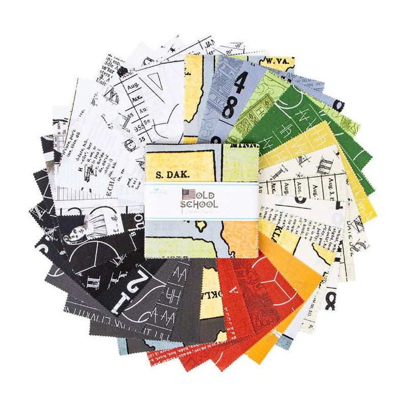 5 Inch Stacker includes 42 squares 5 in x 5 in from the Old School collection by Riley Blake Designs.