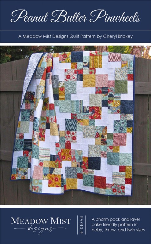Peanut Butter Pinwheels is a fun and easy charm pack and layer cake friendly pattern. When the quilt top is sewn together a secondary design of pinwheels appears. The quilt pattern includes instructions for baby, lap, and twin sizes.