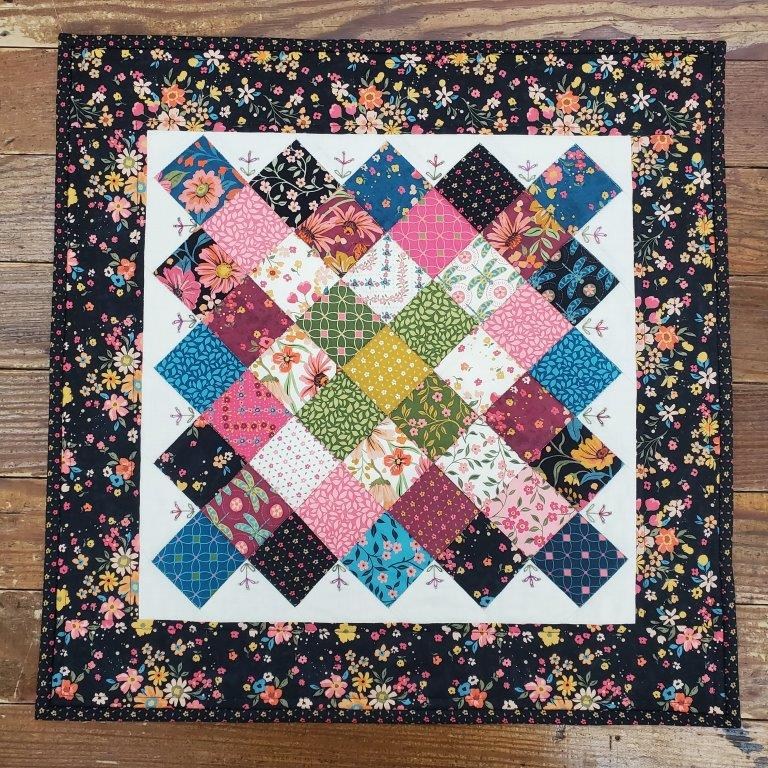 Kit includes exclusive pattern designed by Prairie Point Junction plus all necessary fabrics to make the top and binding of a 20 inch x 20 inch table topper.