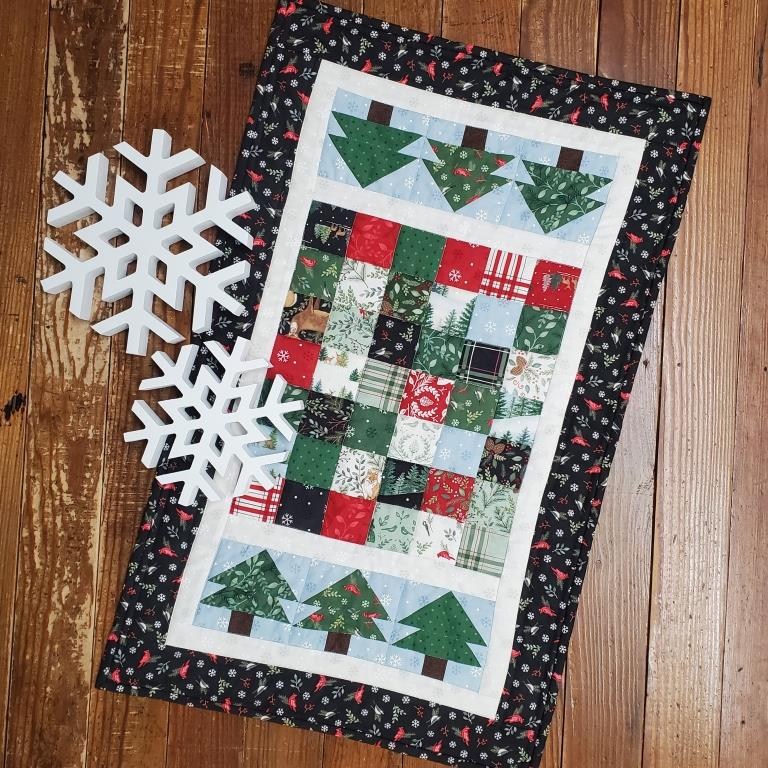 Pattern by Prairie Point Junction includes instructions to make an 18 1/2 inch x 30 1/2 inch wall quilt. Project uses the Woodland Winter line by Deb Strain for Moda.