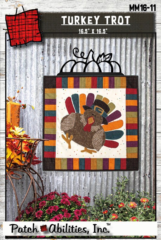 November in Monthly Minis series 16, this block of the month pattern series offers a beginner friendly combination of applique and piecing. A very happy colorful Thanksgiving turkey is made easy using traditional raw edge applique with fusible web. This pattern offers a block of the month stand alone wall hanging quilt measuring 16.5" square. Hangs easily with a 12 inch hanger shown.