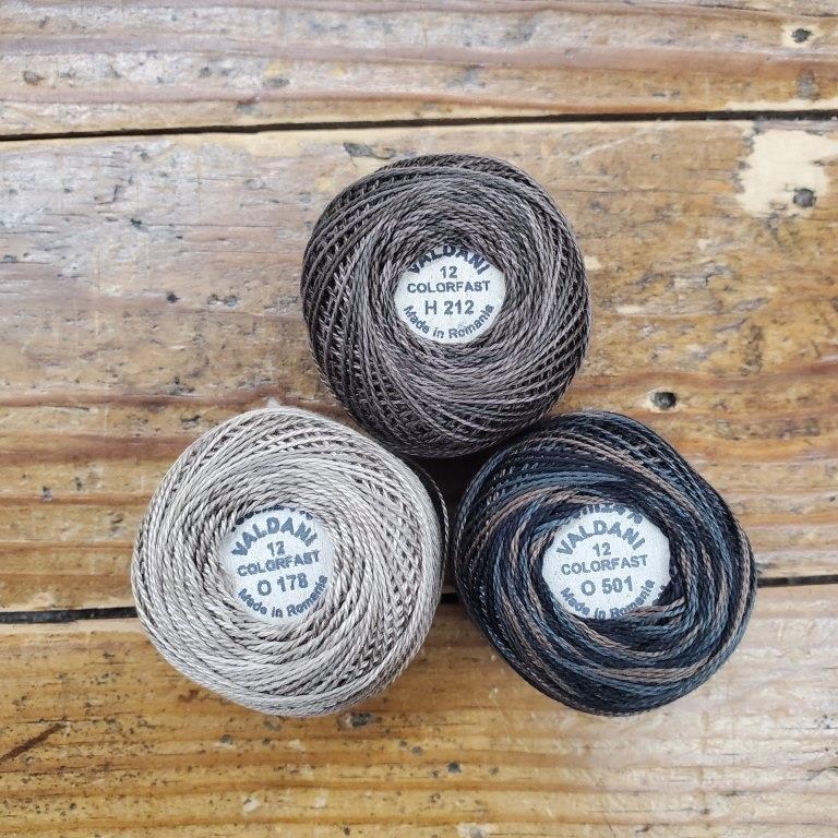 Valdani Pearl Cotton Size 12 collection includes 3 shades of Valdani. Colors include Tea Dyed Stone, Faded Brown, and Ebony Almond.